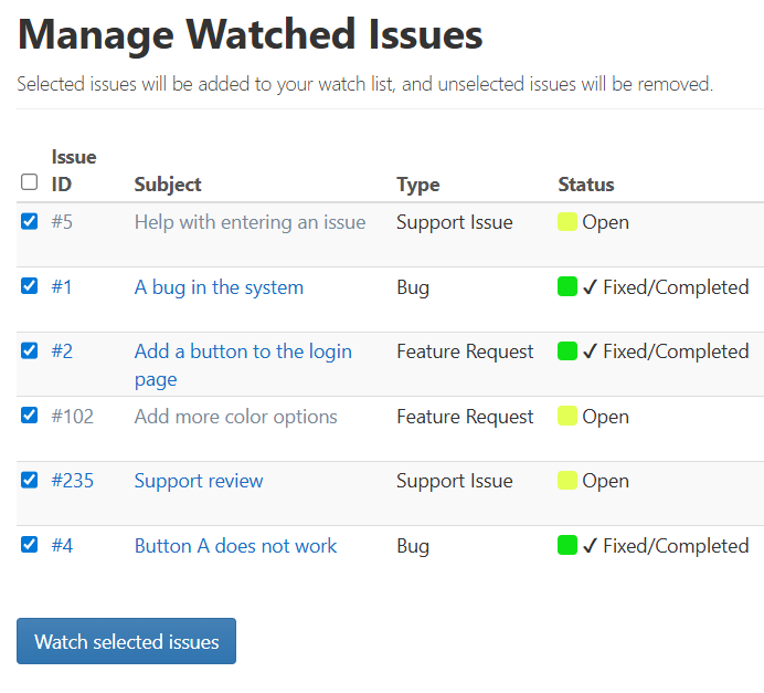 Your watch list enables you to stay up-to-date on issues that interest you. You can add and remove issues from the list at any time. When an issue on your watch list is updated, Squish will automatically e-mail you (unless this feature was disabled in the project settings) to let you know changes were made to the issue. Your watch list is located on the Home page. If the number of issues in your watch list exceeds the number set in your Display Preferences, you can click My Watch List to view the entire list.