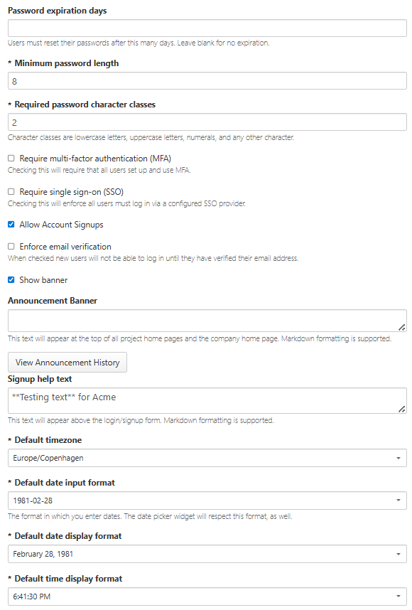 - Announcement Banner – The text in this box will appear in the banner on the company home page and each project’s home page, when the Show banner checkbox is marked. Markdown formatting is accepted in this field.